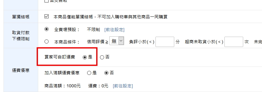 於上架商品時,點選買家可自訂運費右側的「是」,送出後該商品即可讓買家於結帳時自訂運費。