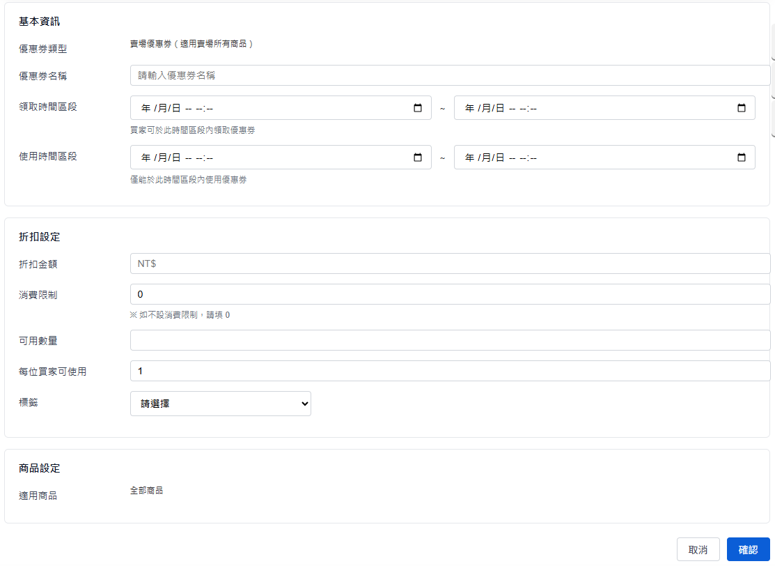 (1) 優惠券名稱:不會顯示在前台,只有賣家看得見。