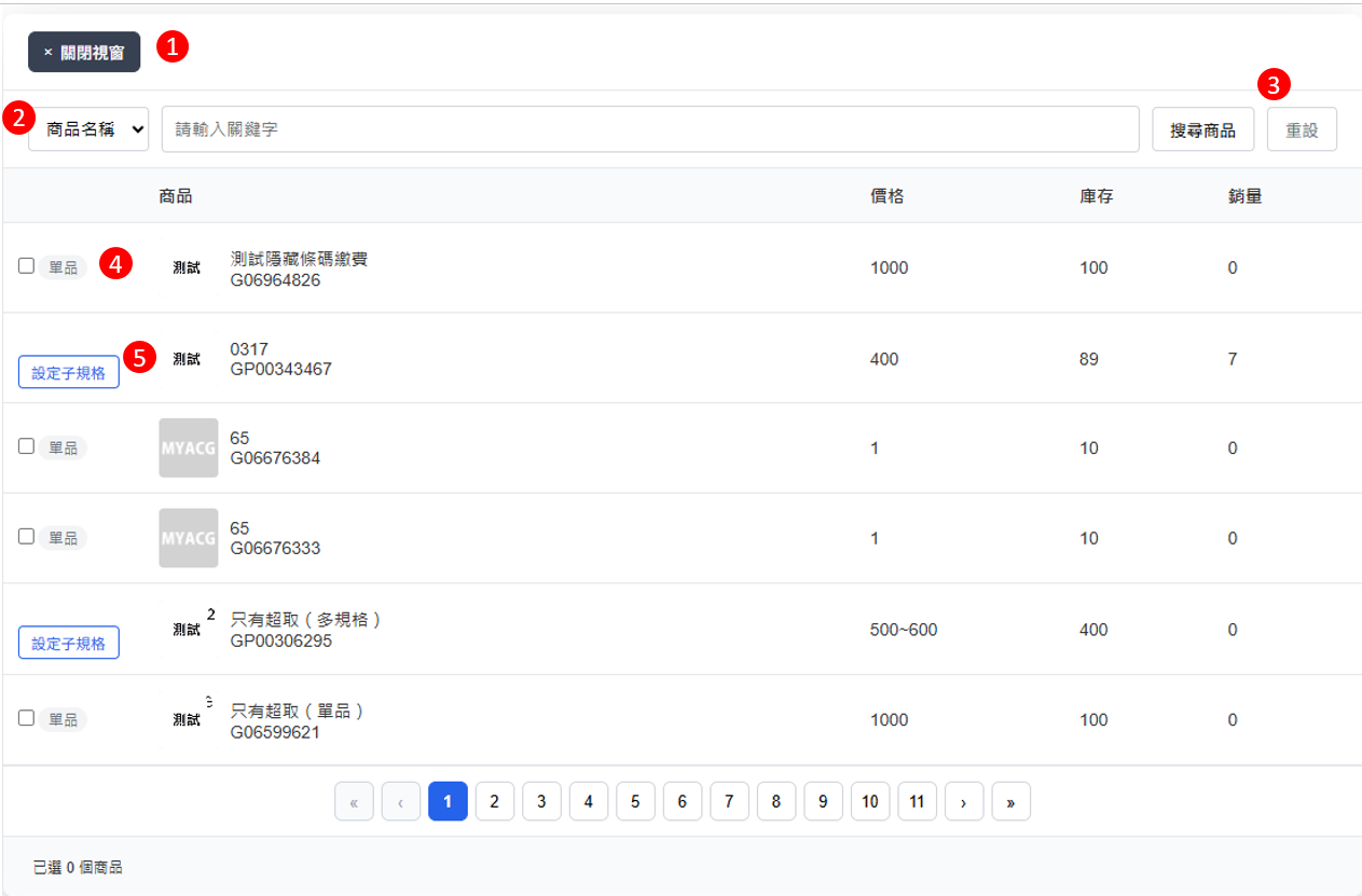 (1)關閉視窗:選完商品後點『關閉視窗』的按鈕,系統就會儲存指定列表並回到原本的視窗。