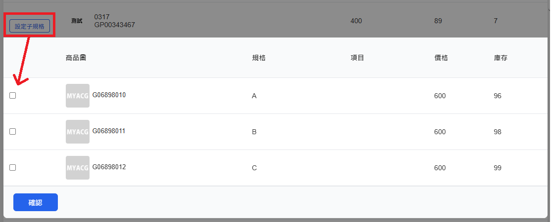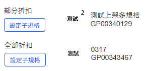 (5)設定子規格:按鈕點下去後可展開該多規格的選取頁面,可以挑選欲打折的子規格。