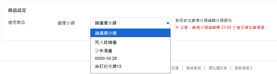 這邊可選擇分類,但要注意二段式預購和合併刊登類型商品如果包含在分類裡頭,該分類將不會出現在列表中。