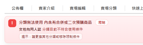 必須將二段式預購和合併刊登類型商品移出該分類,該分類才會出現在選單中。
