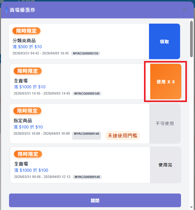 注意:1. 賣場優惠券二段式預購和合併刊登商品無法使用。2. 使用這三種券的訂單將無法使用修改訂單和合併訂單功能。3. 賣家保留隨時修改或提前結束活動的權利,如提前結束活動,您已領取的優惠券也將無法使用。4. 如取消訂單,該賣場優惠券也會失效。