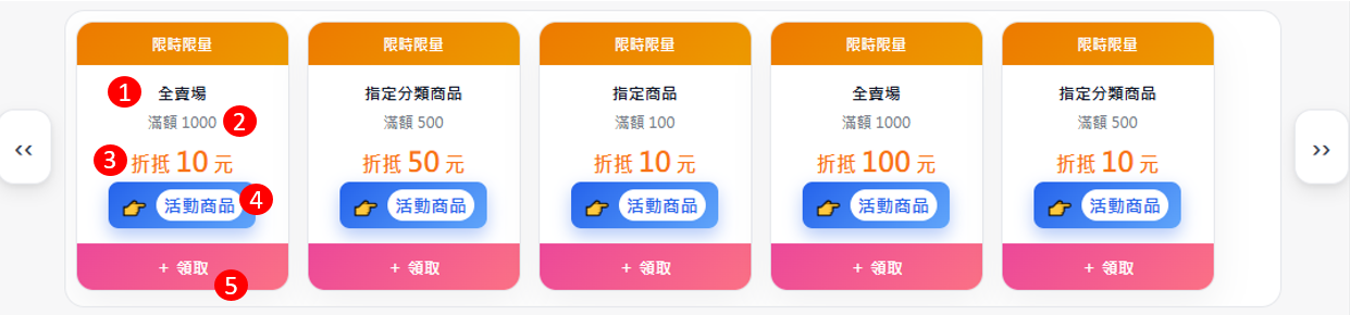 (1) 顯示優惠券類別:全賣場優惠券、分類優惠券、指定商品優惠券。