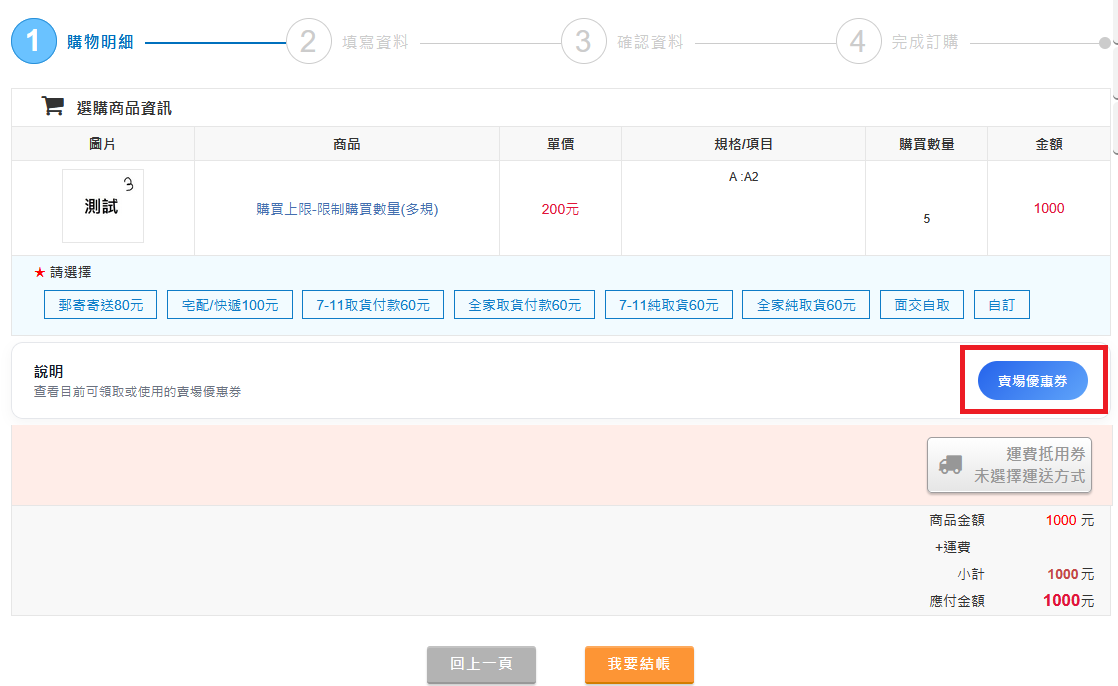 1. 賣場優惠券二段式預購和合併刊登商品無法使用