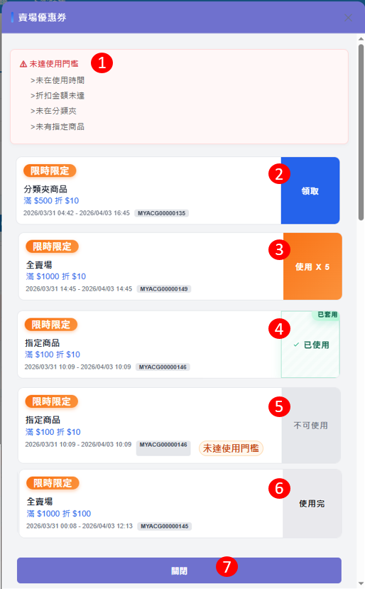 (6)使用完:已使用完該優惠券。